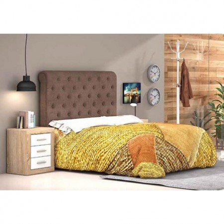 DETALLES Producto en formato KIT Compuesto por cabecero tapizado en tela y dos mesillas de 3 cajones. Colores Cabecero: Chocolate Colores Mesilla: Cambria-Blanco, Cambria-Grafito y Andersen Pino-Gris. Medidas Cabecero: 134 x 115 x 23 cm. (Al x An x Fn) Medidas Mesilla: 60 x 50 x 34,6 cm. (Al x An x Fn)