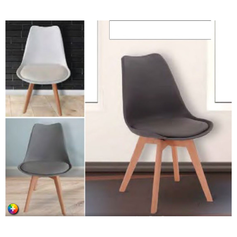 Asiento: Resina sintetica con cojin tapizado PU Patas: madera de pino Colores: Blanco, gris y negro Medidas: 85 x 45 x 48 cm. (Al x An x Fn) Disponible en juegos de 4 unidades