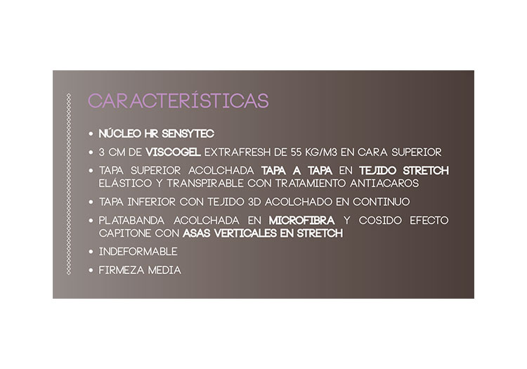 - Inyectadas en la viscoelástica AIR SENSE, las micro perlas de gel frio mejoran sus propiedades aportando mayor frescura y transpirabilidad para regular la temperatura y reducir el exceso de calor desprendido por el cuerpo durante el descanso.