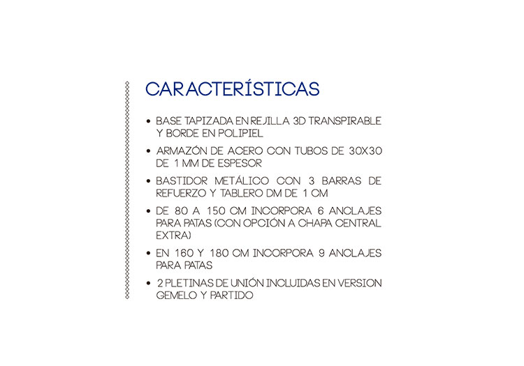 - Base tapizada en rejilla 3D transpirable enmarcada con borde en polipiel o textura a elegir entre colores lisos, decó o barok. Tiene 6 cm de grosor y una estructura metálica con bastidor reforzado mediante tres barras y tablero de partículas.