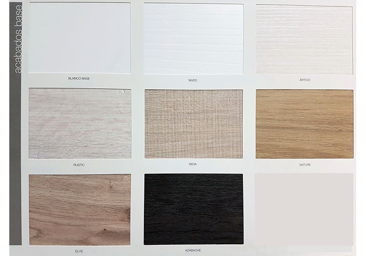 • Colores base: Niveo, Rustik, Nature, Elite, Azabache, Blanco Base. Ártico y Seda.