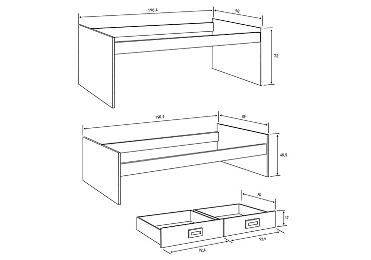 - Compuesto por Compacto Cama 2 Cajones, Estante de pared, Arcón Zapatero y mesa de estudio con modulo 2 cajones hueco.
