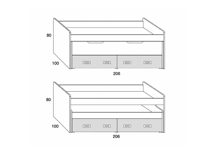 - Compuesto por Compacto Cama 2 Cajones, mesita ruedas 2 cajones, sinfonier, escritorio 120 cm, dos estantes cubo y dos estantes de pared,