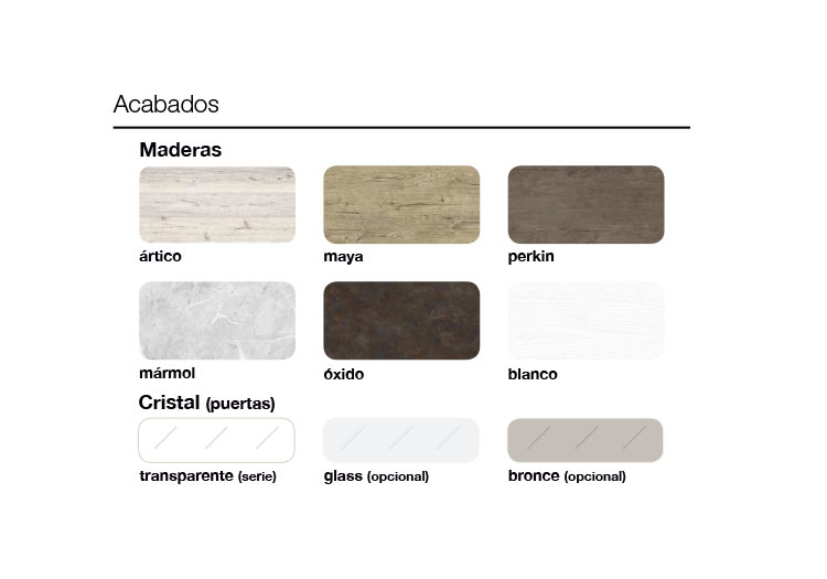 - Colores: Ártico, Maya, Perkin, Mármol, Oxido y Blanco.