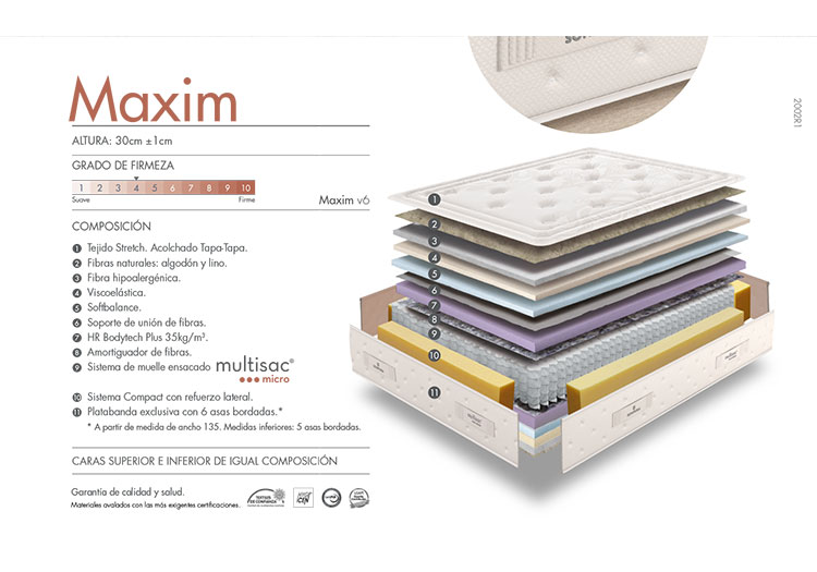 - El colchón Maxim de Sonpura está compuesto de un núcleo Multisac Micro con más de 1300 muelles ensacados (en ancho de 150), más una espumación Bodytech Plus de 35 Kg. de densidad, y un acolchado de viscoelástica, que le aportan una adaptabilidad perfecta al cuerpo. Cuenta también con capas antialérgicas de lino y algodón que aportan un descanso fresco y transpirable.