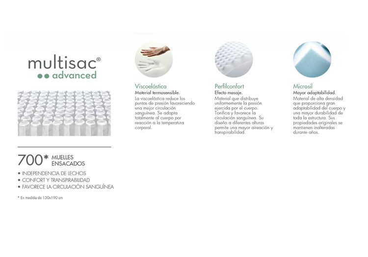 - El núcleo dispone de 700 muelles embolsados individualmente (colchón de 150 cm.) favoreciendo una precisión ergonómica en el descanso.. El grueso del alambre de acero con el que se construye el muelle MULSTISAC ADVANCE es de 1.9 mm.