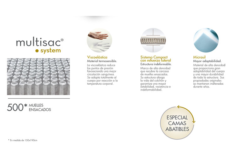 - ESTRUCTURA DE MUELLE MULTISAC. Multisac® System aísla en sacos individuales cada uno de los muelles que componen su interior y los distribuye siguiendo la posición natural del cuerpo.