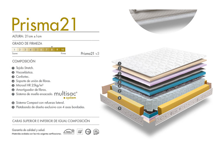 - El colchón Prisma cuenta en su núcleo con el sistema de muelles ensacados de Sonpura Multisac y, en sus acolchados principales, con capas de Confortec -espumas patentadas por Sonpura-, todo combinado ofrece un descanso firme y de sensación elástica en el acolchado. Es el colchón para parejas más económico de este fabricante.
