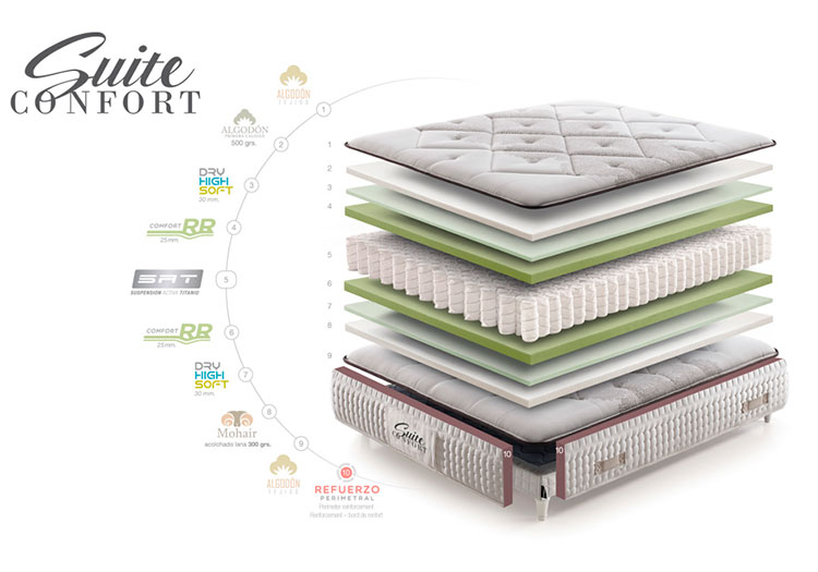 - El modelo Suite Confort  cuenta con un núcleo de muelles ensacados dispuestos en panal, que incorpora una aleación de Titanio, aportando una mayor duración y resistencia del colchón. Acolchado principal de espumación Confort RR y Dry High Soft, que favorece la adaptabilidad y acolchado superficial de fibras, Algodón por una cara, y Lana por la otra, favoreciendo la transpirabilidad y la regulación de la temperatura.