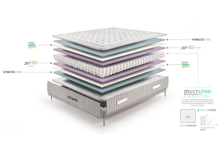 - El colchón STARK cuenta con un núcleo de muelles ensacados Multipro, que van embolsados en sacos más pequeños y más flexionados, de forma que conceden al núcleo mayor firmeza y estabilidad. Acolchado principal de viscoelástica de densidad 50 Kg/m3, combinado con capas de espumación HD y Dry High Soft.