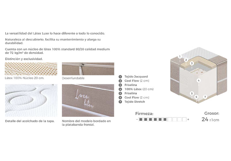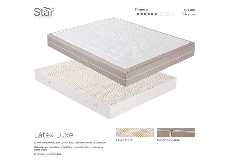 - La versatilidad del colchón Látex Luxe lo hace diferente a todo lo conocido. Naturaleza al descubierto, facilita su mantenimiento y alarga su durabilidad. Distinción y exclusividad.