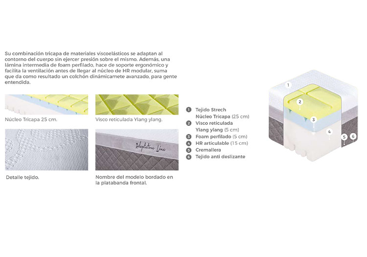 - Núcleo Tricapa. Núcleo con tecnología revolucionaría en el sector del descanso. Se combinan tres materiales viscoelásticos para ofrecer la adaptabilidad perfecta al durmiente. La capa de viscoelástica perfilada y la lámina de caucho perfilado ofrecen un efecto masaje beneficioso en toda la zona de la columna y se adapta para ofrecer la postura adecuada durante el descanso, al mismo tiempo que regula la temperatura y airea el colchón; de esta forma se evita la acumulación de ácaros y hongos.