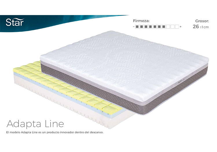 - El modelo de colchón Adapta Line es un producto innovador dentro del descanso. Su combinación de núcleo Tricapa de materiales viscoelásticos se adaptan al contorno del cuerpo sin ejercer presión sobre el mismo. Además, una lámina intermedia de caucho perfilado, hace de soporte ergonómico y facilita la ventilación antes de llegar al núcleo de HR modular, suma que da como resultado un colchón dinámicamente avanzado, para gente entendida.