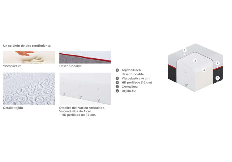 - NÚCLEO HR PERFILADO 20 CM. (Alta resiliencia). Material de célula abierta de alta densidad la cual confiere al colchón la firmeza necesaria para que el durmiente pueda descansar de forma eficiente durante largas horas. Especial para ser articulado.