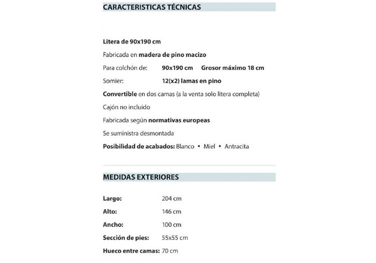 - Hueco entre camas: 70 cm.