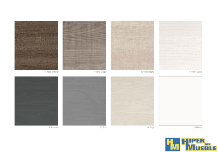 Colores: Roble Britania, Fresno Estepa, Roble Legno, Fresno Glacial, Antracita, Gris, Beige y Blanco.