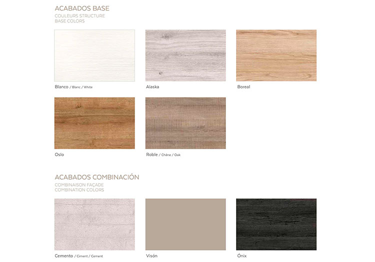 - Colores Base: Blanco, Alaska, Boreal, Oslo y Roble.