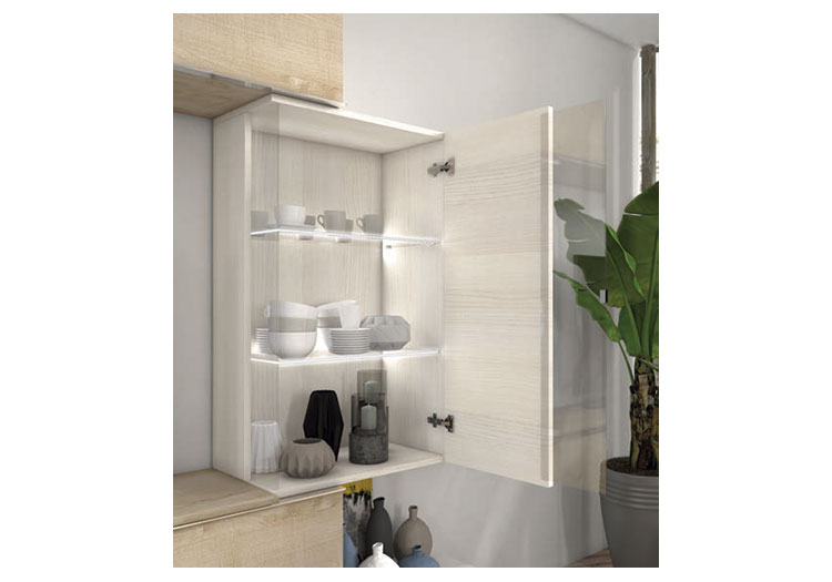 - Bisagras de 35 mm. regulables, montaje rápido sistema click,, con pistón amortiguador para el cierre de la puerta.