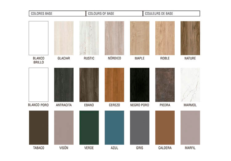 - Acabados en chapa sintética satinada, en poro real y poro noble.