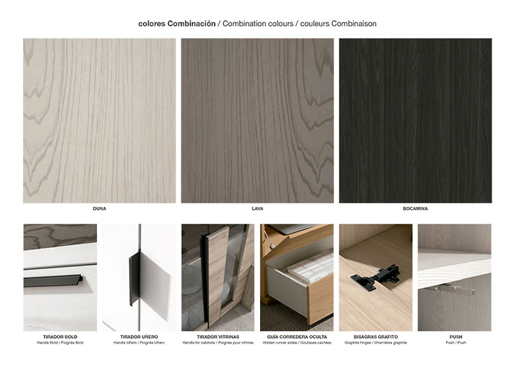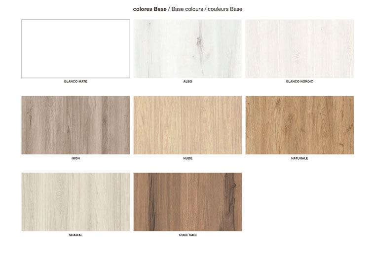 • Colores base: BLANCO MATE, ALBO, BLANCO NORDIC, IRON, NUDE, NATURALE, SHAMAL Y NOCE SABI.