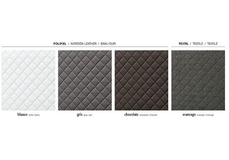 - Colores Tapizados: POLIPIEL: Blanco, Gris y Chocolate. TEXTIL: Marengo.