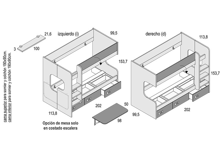 - Quitamiedos abatible y Base Tablero Cama Superior opcional.